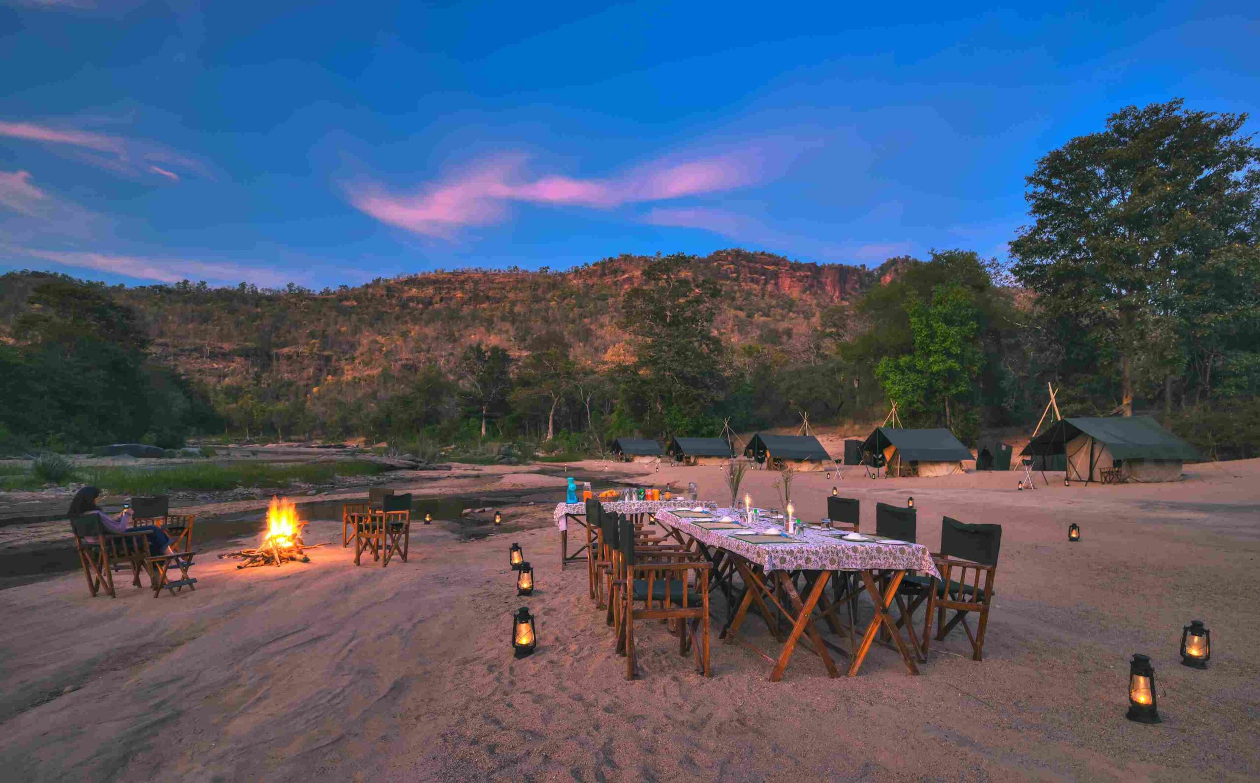 - Evening arrival at Deheliya campsite on the Denwa River.